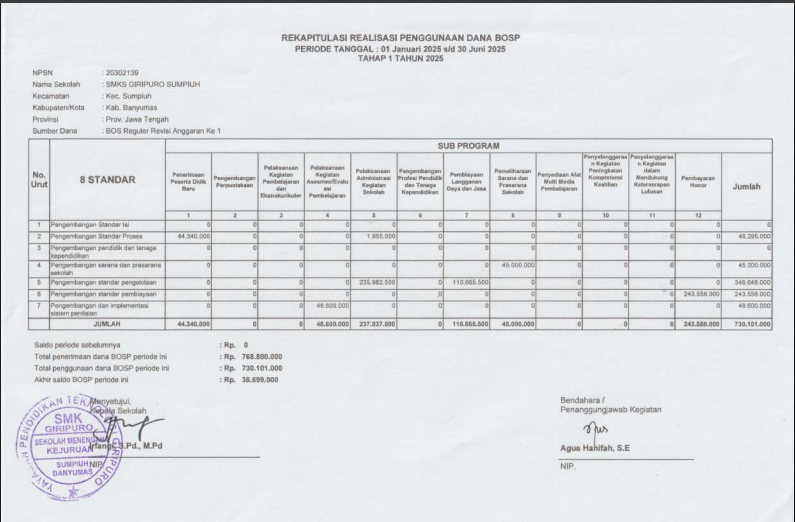 SMK Giripuro Sumpiuh Umumkan Rekapitulasi Realisasi Dana BOSP Tahap I Tahun 2025
